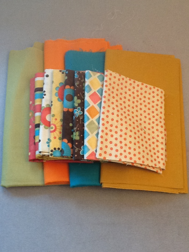Here is the fabric i got from Ireland - the prints. Ive added some solids from my stash. Im thinking of doing the nine patch block where you cut them off center and mis and match. I've seen it on one of the blogs i read so I'll have to go looking.